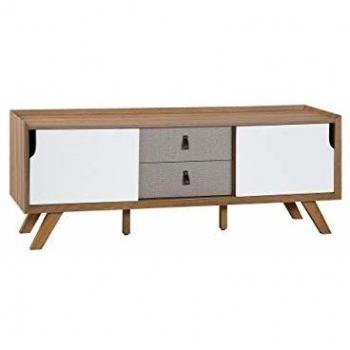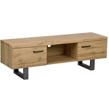 El soporte Atlanta en madera clara, con patas de metal, sostiene televisores hasta 57 ”. Sus dos estantes amplios alojan reproductores y sus cuatro cajones guardan controles y cables, manteniendo un ambiente ordenado y moderno.