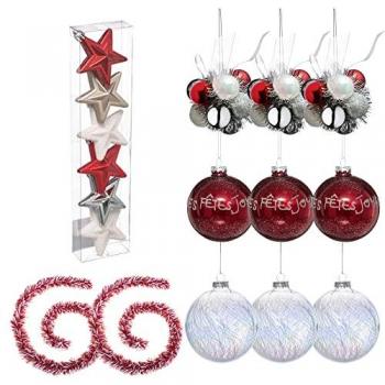 Pack Decoración Navideña: Abeto Blanco 70 cm con Base, 6 Bolas Rayadas Blancas y Rojas, Estrella Roja y Guirnalda Espumillón Blanca y Roja