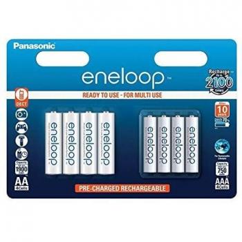 Ocho pilas recargables Panasonic Eneloop micro AAA de 1,2 V y 750 mAh cada una, con tecnología NiMH que garantiza alta capacidad y baja autosdescarga para dispositivos portátiles y equipos electrónicos.