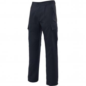 Pantalones de trabajo azul marino con corte ajustado y tejido mixto de poliéster y algodón que ofrece flexibilidad y resistencia. Sus numerosos bolsillos, con cierres seguros, permiten llevar herramientas y objetos personales sin sacrificar comodidad ni estilo.