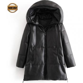 Fandy Lokar de invierno con capucha para mujer, Parkas largas con cremallera a la para mujer, chaquetas holgadas elegantes de algodón y cuero PU para mujer IQ