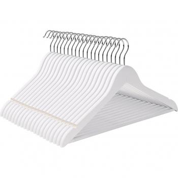 Perchas de madera natural, tamaño 44,5x23 cm, con gancho giratorio 360º y barra inferior para pantalones. Incluye muescas para trajes y camisas, ideal para organizar armario sin esfuerzo.