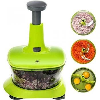 El cortador Kalokelvin de 900 ml permite triturar cebollas, verduras, carne y hierbas en segundos gracias a sus cinco cuchillas de acero inoxidable; su mango antideslizante facilita el agarre y la limpieza rápida.