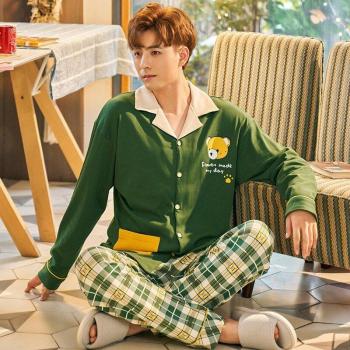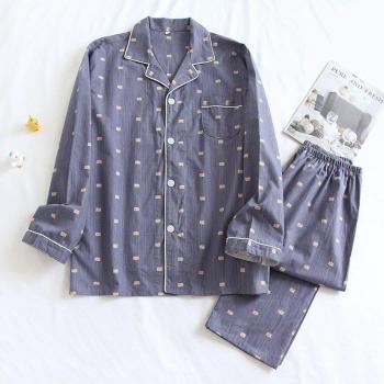 Lavados nuevos Pijamas delgados de algodón para hombres de solapa de manga larga pantalones largos Pijamas de otoño pijama de cuadros Set 2 piezas ropa de dormir