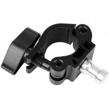 Soporte de cuello flexible negro con pinza y clip de estudio, mide 65 mm alto, 40 mm ancho y 150 mm largo. Fabricado en metal y goma para firmeza; rosca 1/4" cámara y 3/8"/1/4" trípode. Perfecto para ajustes precisos y versátiles.