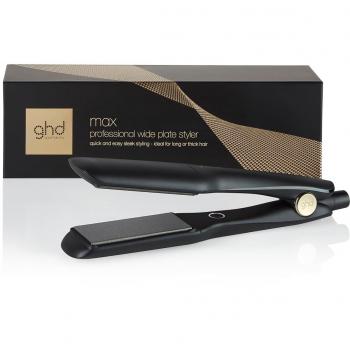 Plancha profesional GHD MAX con placas de titanio de 45 mm, temperatura regulable hasta 230 °C y tecnología inteligente que detecta el calor ideal para cada tipo de cabello, ofreciendo alisado rápido y sin frizz mientras protege la fibra capilar.