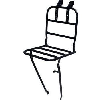 Estructura de acero negro con fijación directa al eje delantero de 28 mm, equipada con soporte para faro y bisagra amortiguadora que permite un montaje estable y silencioso; ligera, resistente y fácil de instalar en cualquier bicicleta urbana o de aventura.