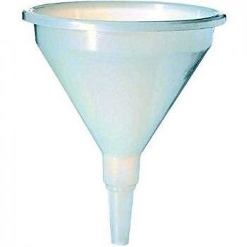 Embudo de polietileno con asa ergonómica y tubo flexible de 160 mm por 470 mm que retiene hasta 1,2 l. Su construcción resistente a aceites y ácidos evita derrames, ideal para laboratorios o talleres.