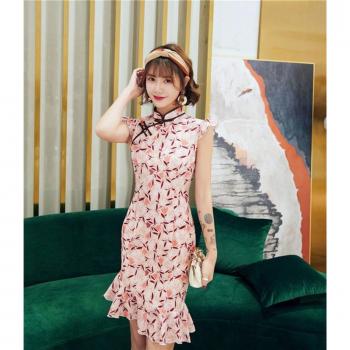 Linda chica cheongsam de gasa corto de cola de pescado de cheongsam falda chica joven slim estilo chino de diario boda Qipao