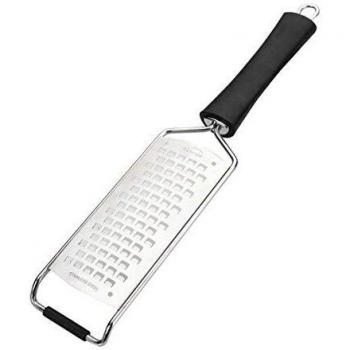 Rallador de seis caras en acero inoxidable Lacor, perfecto para queso rallado fino o verduras crujientes; su diseño compacto facilita el almacenamiento y su mango antideslizante asegura un agarre firme durante la preparación culinaria.