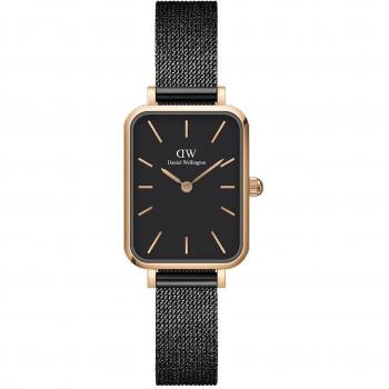 Reloj femenino con correa de piel negra y esfera rectangular dorada que destaca por su diseño minimalista; movimiento cuarzo, dimensiones 15,4 × 18,2 mm, ideal para lucir un estilo contemporáneo y refinado.