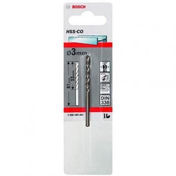 Broca helicoidal de acero rápido laminado, 3 mm de diámetro y 61 mm de longitud, con ángulo de punta de 118°. Diseñada para perforar metales blandos y medios con alta velocidad y precisión.