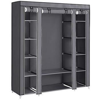 Este armario plegable de tela negra mide 88 × 45 × 168 cm y cuenta con dos barras colgantes y seis estanterías ajustables, ofreciendo un espacio versátil para organizar ropa, accesorios y objetos personales en cualquier habitación.