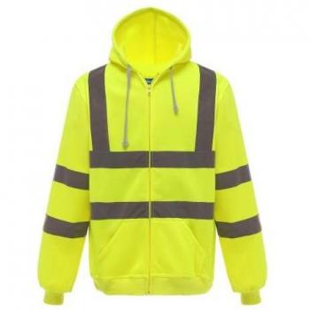 Sudadera con capucha ajustable y cremallera total que incorpora tejido reflectante para garantizar máxima visibilidad en entornos de poca luz, ofreciendo comodidad y protección durante jornadas nocturnas o bajo tráfico intenso.