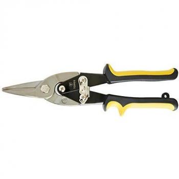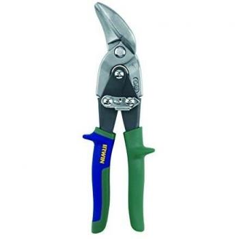 Tijera corta chapa Irwin 10504311N con mango amarillo antideslizante y hoja doble de acero inoxidable, perfecta para cortes rectos y curvas amplias hasta 250 mm en pladur o láminas delgadas.