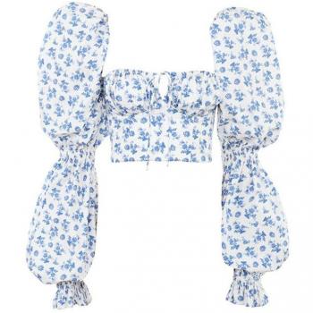 Crop Top Acanalado Floral con Manga Puff y Encaje