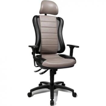 Silla de oficina con asiento acolchado y respaldo de malla que mantiene el aire fresco; brazos ajustables en altura y ángulo, soporte lumbar mediante gasfeder, giro completo a 360 grados y ajuste sin escalones.
