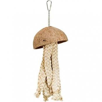 Cuerda de sisal natural de 35 cm con hojas de palma y material de nido integrado, diseñada para estimular el juego activo y la exploración sensorial de los pájaros en su entorno.