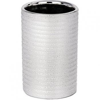 Vaso de cerámica plateada con acabado cromado y textura sutil que protege tus cepillos del agua. Sus 8,3 cm de diámetro y 11,6 cm de altura combinan estilo moderno con practicidad para cualquier baño.