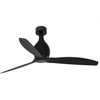 Ventilador de techo negro mate de 128 cm con tres palas de madera que producen un flujo aire suave y silencioso; motor DC asegura eficiencia energética y operación casi inaudible, perfecto para espacios modernos sin luz integrada.