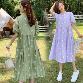 Vestido corto de algodón de estilo coreano para mujer embarazada, vestido de maternidad de manga corta con cuello vuelto, cintura con cordón, azul y blanco