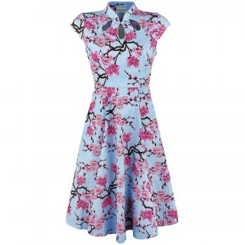 Vestido de longitud media con un estampado multicolor audaz y detalles retro rockabilly. Su silueta ceñida y escote discreto realza la figura, mientras el tejido ligero ofrece comodidad para cualquier ocasión festiva.
