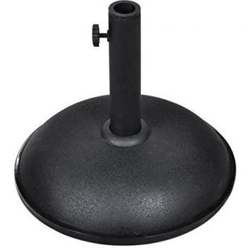 Soporte circular en acero negro con acabado pulido que mide 45,5 cm y pesa 9 kg; su construcción robusta mantiene parasoles de hasta 1,5 in de diámetro, ideal para patios o terrazas.