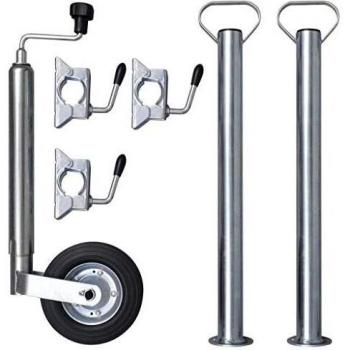 Rueda jockey de acero galvanizado que se adapta a tubos de 48 mm, con capacidad de carga de 150 kg y una abrazadera dividida para fijación segura en remolques o caravanas.