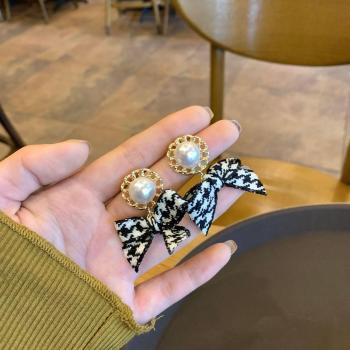 Pendientes Coreanos Vintage de Invierno con Lazo de Pata de Gallo Blanco, Clip de Perlas, Sin Perforación