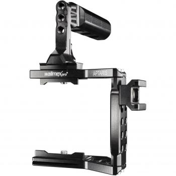 Estructura ligera de aluminio aeronáutico en negro que envuelve la Sony NEX con un diseño compacto de 168 mm ancho, 118 mm profundidad y 144 mm altura, ofreciendo protección firme y estabilidad para grabaciones profesionales.