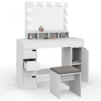ZELIA – Coiffeuse blanche miroir LED, 4 compartiments, 5 tiroirs, caisson & tabouret assis
