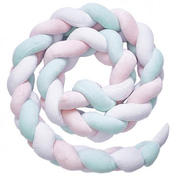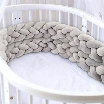 Un coussin serpent de peluche gris, longueur 2 m, qui enroule les bords du lit pour protéger le bébé des chocs tout en ajoutant une touche cosy et ludique à la chambre.