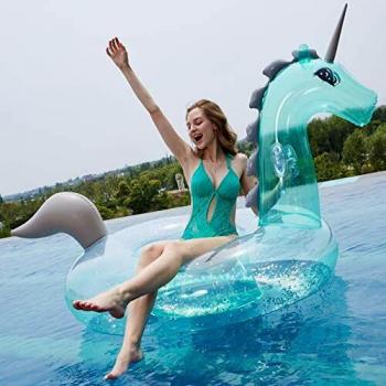 Myir Paillettes Transparente Bouée Licorne Gonflable, Géant Jouets Gonflable Flotteur de Plage Ocean, Matelas Gonflable de Piscine pour Enfant Adultes (Blanc)