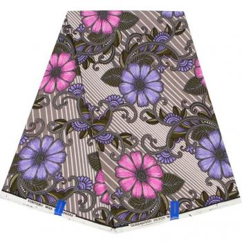 Cire africaine, pagne coton, fleurs violettes et roses, 6 mètres