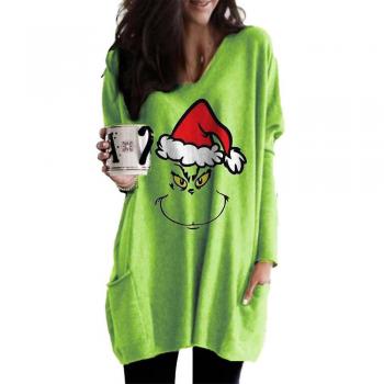 Waytogo Femmes Dames Noël Le Grinch T-shirt À Manches Longues Casual Baggy Col V Blouse Pull Longs Tops Avec Poches A XL