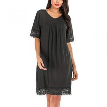 ABirdon Chemise de Nuit en Coton pour Femmes Col en V Manches Courtes Dentelle S-XXL, Gris Foncé, XL