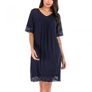ABirdon Chemise de Nuit Femme Coton Col en V Manches Courtes Dentelle S-XXL, Bleu Foncé, M