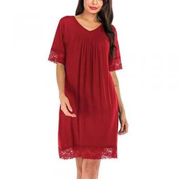 ABirdon Chemise de Nuit Femme Coton Col en V Manches Courtes Dentelle S-XXL, Vin Rouge, XXL