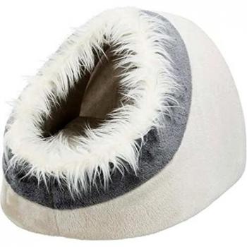 A snug white‑and‑grey wall‑mounted cat cave measures 42 × 29 × 28 cm, providing a plush, washable hideaway for indoor cats of any age with soft fabric walls and a cozy entrance that invites quiet play.