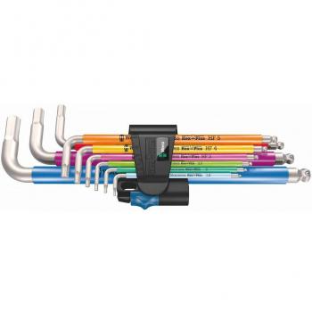 Nine‑piece Wera L‑Torx set with bright colour coding, ball‑end tips for TX8–TX40 screws, steel shafts certified CE, GS, DVE and a built‑in magnetizer that keeps bits secure during work.