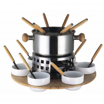 Kit Fonduta da 6 Pezzi in Acciaio Inox e Vassoio Girante in Legno