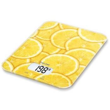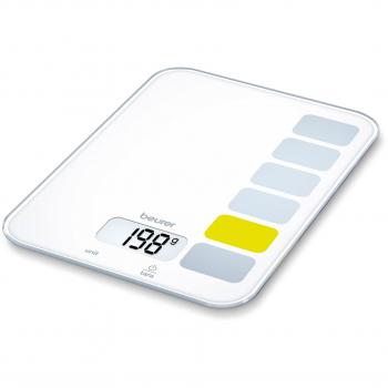 Bilancia digitale Beurer KS 19 Slate con schermo LCD luminoso e auto‑spegnimento; capacità di 5 kg, precisione di 1 g. Vetro trasparente su base nera, alimentata da una singola batteria CR2032.