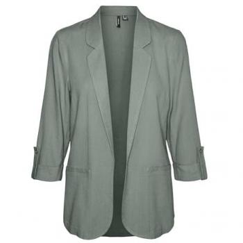 Blazer corto in verde salvia con tessuto misto lino-viscosa che dona morbidezza e struttura. Il taglio loose avvolge leggermente la silhouette, mentre le maniche a tre quarti e il collo V offrono un look fresco e versatile per ufficio o serata informale.