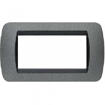 Piastra in metallo cromato con cornice sottile che ospita quattro moduli elettrici; il suo finish lucido dona un tocco di modernità, mentre la struttura robusta assicura resistenza alla corrosione e facilità d’installazione.
