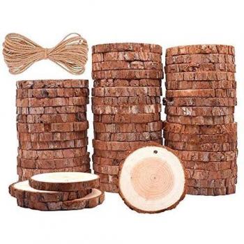 Dischetti di legno grezzo da 6‑7 cm con foro centrale e 10 m di corda di juta, perfetti per realizzare centrotavola rustici, decorazioni natalizie o segnaposto personalizzati in stile naturale.