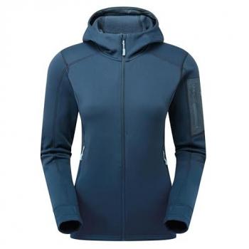 Giacca da donna Rab Modulus in pile blu tempestoso, con cappuccio regolabile e tasche a zip laterali per proteggere oggetti essenziali; il tessuto termico leggera offre calore rapido senza appesantire, ideale per trekking, arrampicata o giornate fresche all’aperto.