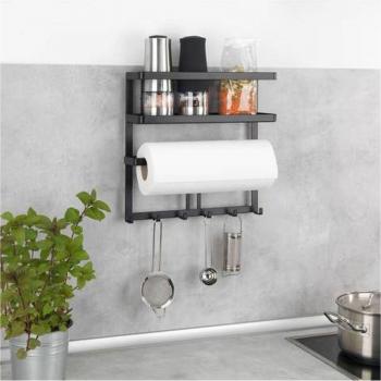 Mensola magnetica per frigorifero Magna, con porta spezie, portarotolo magnetico e ganci per appendere utensili da cucina, in metallo e bambù,