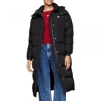 Piumino lungo nero con cappuccio, taglia XL per donna, silhouette slim fit che avvolge la figura in eleganza discreta. Realizzato in poliestere riciclato, offre calore sostenibile e un logo inciso sul davanti per un tocco di stile raffinato.