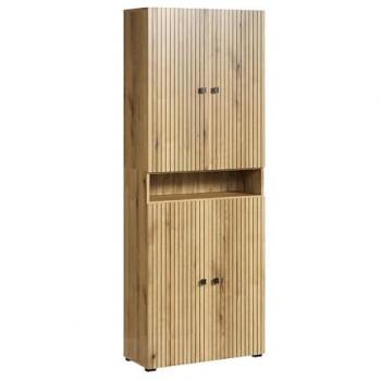 Colonna da bagno alta 186 cm in verde effetto scanalato con finitura opaca, 31 cm di larghezza. Due porte a maniglia metallica e due nicchie interne offrono spazio per asciugamani, prodotti da toilette e decorazioni, ideale per ambienti moderni.