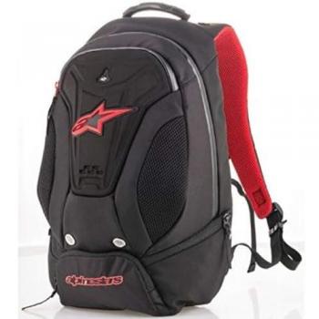Zaino tecnico in tessuto resistente con finitura nera e bianca, pensato per motociclisti. Ampio compartimento principale, tasche laterali e retrospettiva con cerniere a scatto, spalline imbottite e cintura lombare regolabile per comfort durante lunghi viaggi.